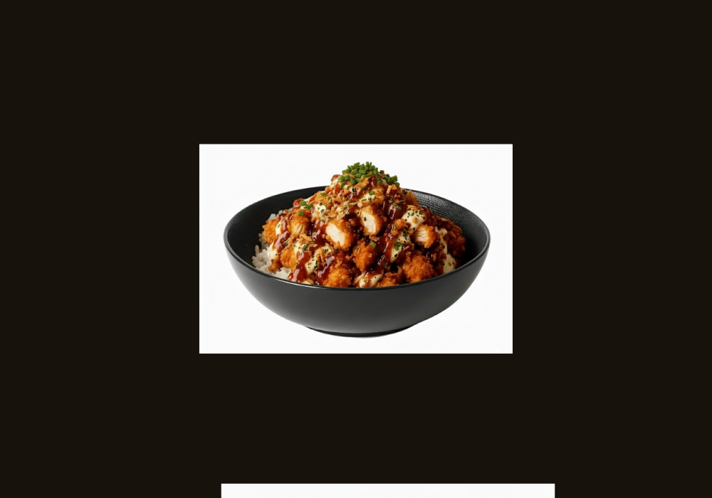 RIZ PARUMÉ,POULET FRIT CROOUSTILLANT(HALAL), OIGNON FRITS NORTE SAUCE MAISON & SAUCE SRIRACHA