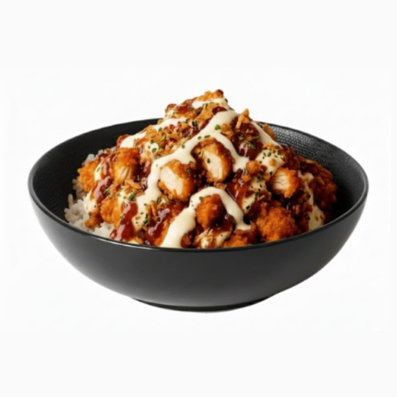 RIZ PARUMÉ,POULET FRIT CROOUSTILLANT(HALAL), OIGNON FRIT, SAUCE MAISON, SAUCE AIGRE DOUNCE & SAUCE SPICY DYNAMITE