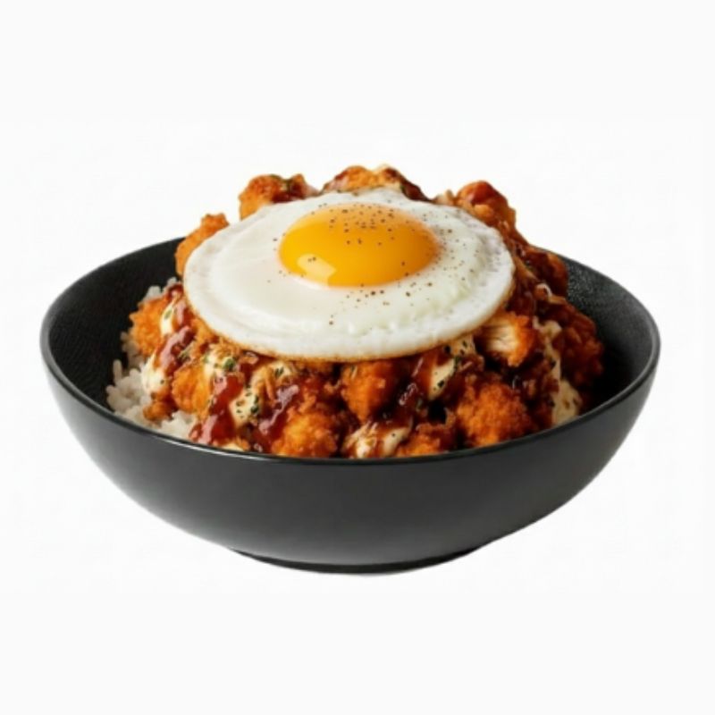 RIZ PARUMÉ,POULET FRIT CROOUSTILLANT(HALAL), OIGNON FRIT, BACON GRILLÉ, OEUF, SAUCE MAISON
