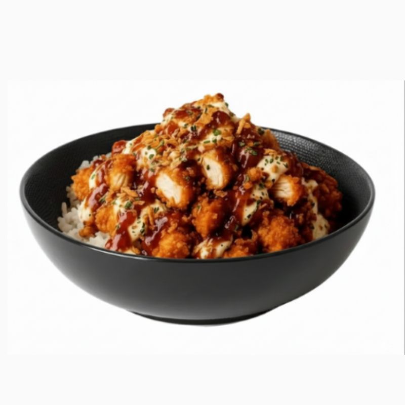 RIZ PARUMÉ,POULET FRIT CROOUSTILLANT(HALAL), OIGNON FRIT, SAUCE MAISON, SAUCE AIGRE DOUNCE & SAUCE SPICY DYNAMITE