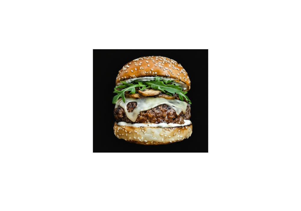 Steak 90G(Halal), Champignons, Salade Roquette, Oignon Rouge, oignon caramelise, tomate, sauce biggy, Fromage Bleu