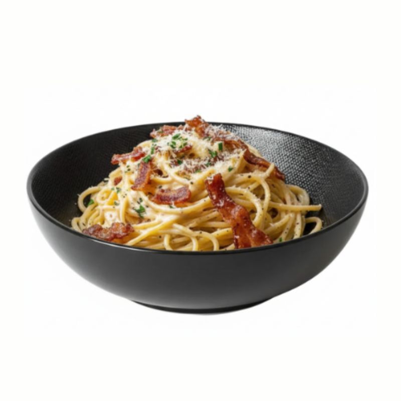 SPAGHETTIS AU BLÉ COMPLET, CHAMPIGNONS DE PARIS, LARDONS DE BACON, PARMESAN RÀPÉ, PETITS SUISSES, JAUNE D’OEUFS DIGNON, SEL, POIVRE