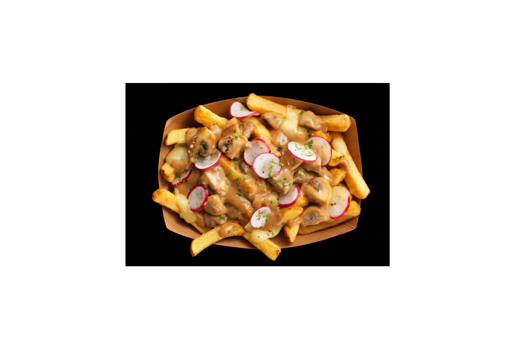 FRITES CROUSTILLANTES, SAUCE POUTINE, FROMAGE A POUTINE, CHAMPIGNONS, TRANCHES DE RADIS CORIANDRE, SEL, POIVRE